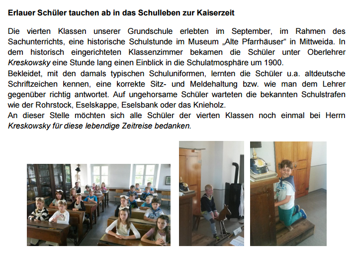 Am 9.6.2017 wurden beim Grundschulsportfest in Rochlitz wieder die sportlichsten Grundschulen im Kreis Mittelsachsen ermittelt. Dabei verpassten unsere besten Sportler nur knapp einen Platz auf dem Siegerpodest. Die 18 Schüler der Klassen 2 bis 4 mussten in den Disziplinen 50m Lauf, Weitsprung und Schlagballweitwurf möglichst viele Punkte für ihre Schule sammeln. Am Ende belegte die Grundschule Erlau einen guten 4. Platz. Es gewann die Grundschule aus Langenleuba-Oberhain, vor Seifersbach und Wiederau.